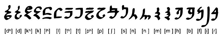 | Romanization | dh | d | kh | k | lh | l | th | t | ph | p | sh | s | n | nn | m | mm | h | b | f | r |